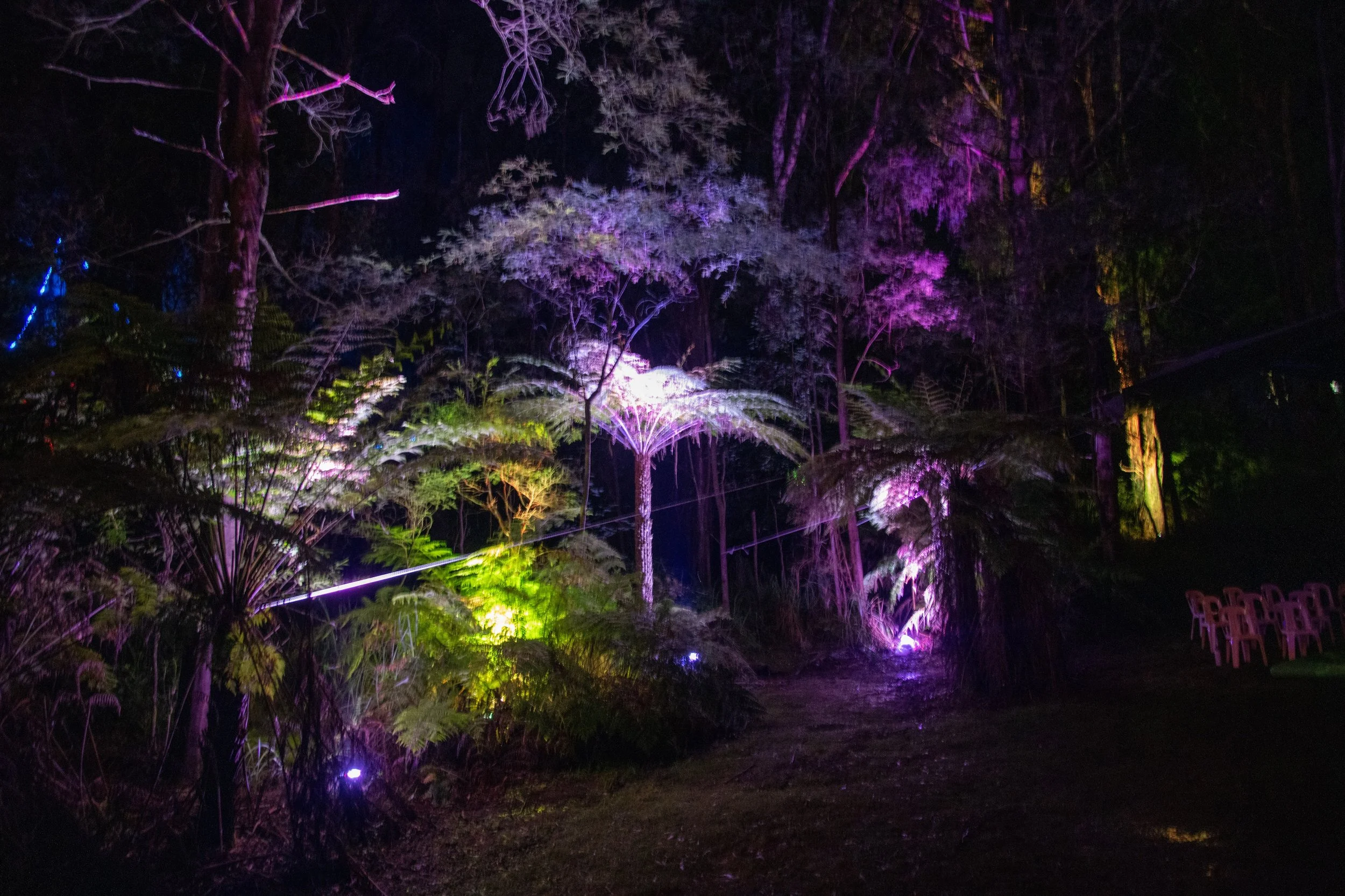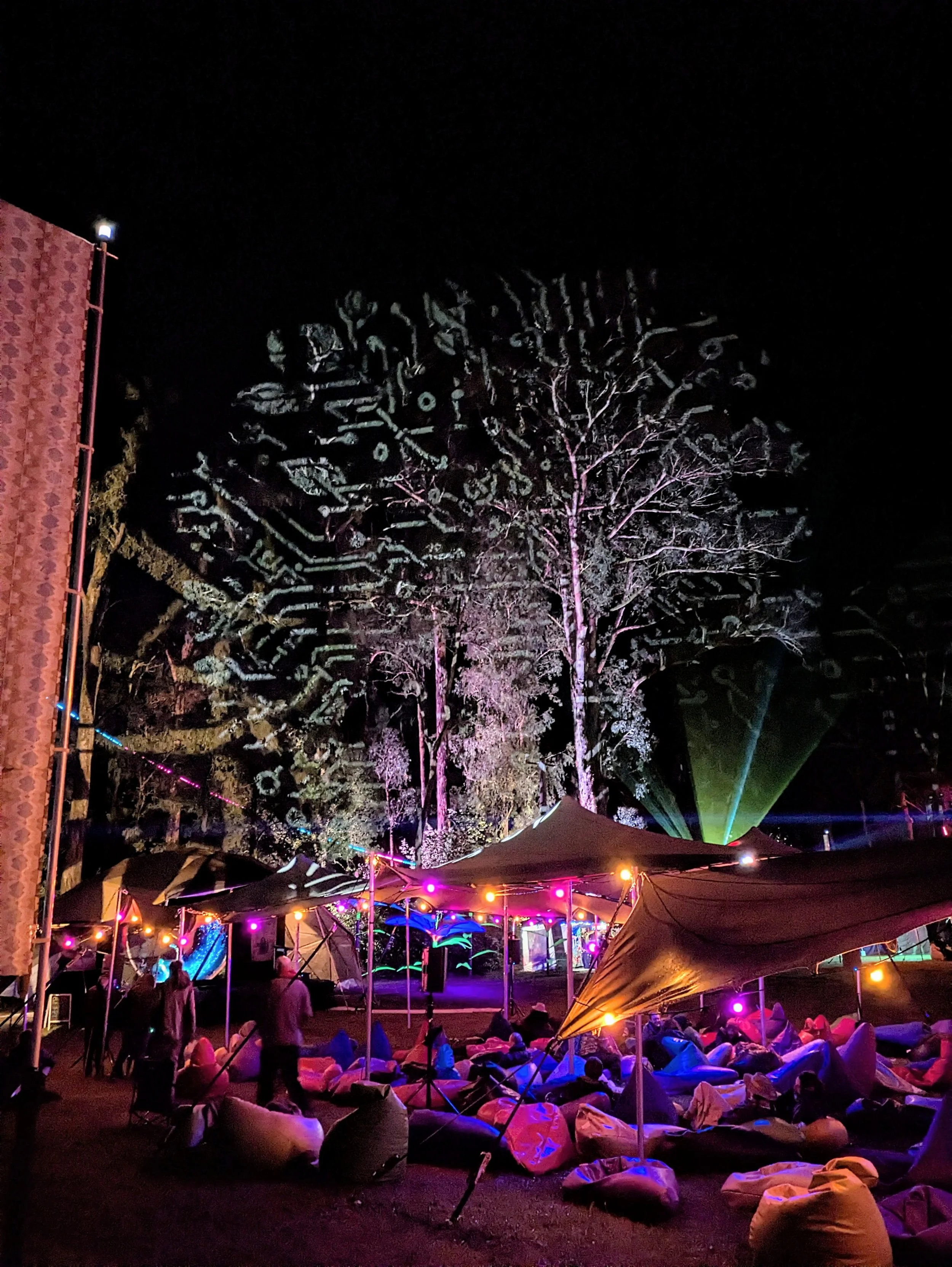 By night, the tone shifted again. Music began drifting out from the Night Owls building, its gingerbread-style entrance leading into a dim space of visuals and dance. DJs took turns soundtracking the evening as conversations gave way to movement. The landscape lit up, artworks appearing through the trees, and a distinctly luminous aesthetic settled over the site that reminded of certain dimensional spaces.