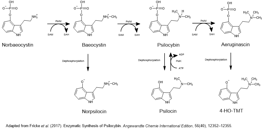 PsiK phosphorylates 4-hydroxytryptamine to yield norbaeocystin. PsiM methylates the amine to produce baeocystin, which is then converted to psilocybin through additional methylation of the amine. Psilocybin is dephosphorylated to psilocin, which can revert to psilocybin through the action of PsiK (Figure 2).